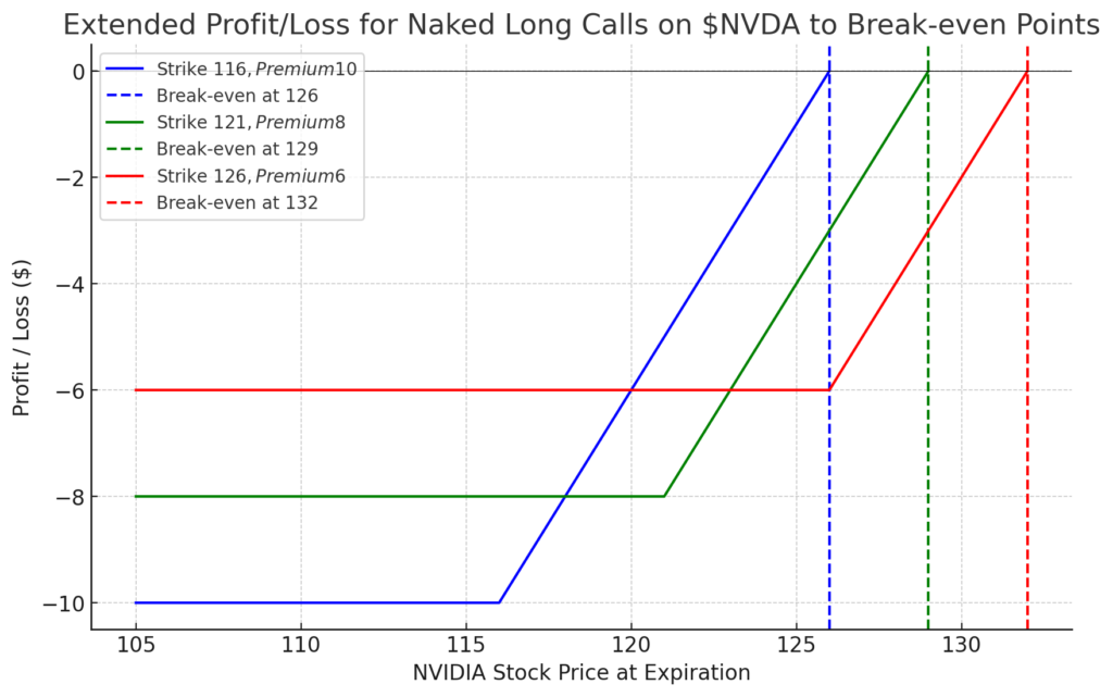 Here’s an example of 3 different strike prices for NVIDIA stock trading at $116 and how to calculate break even at expiration.